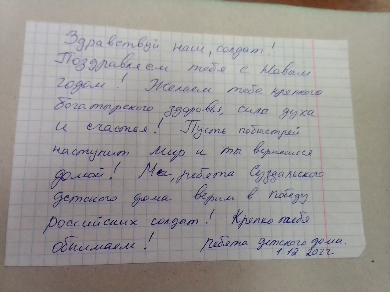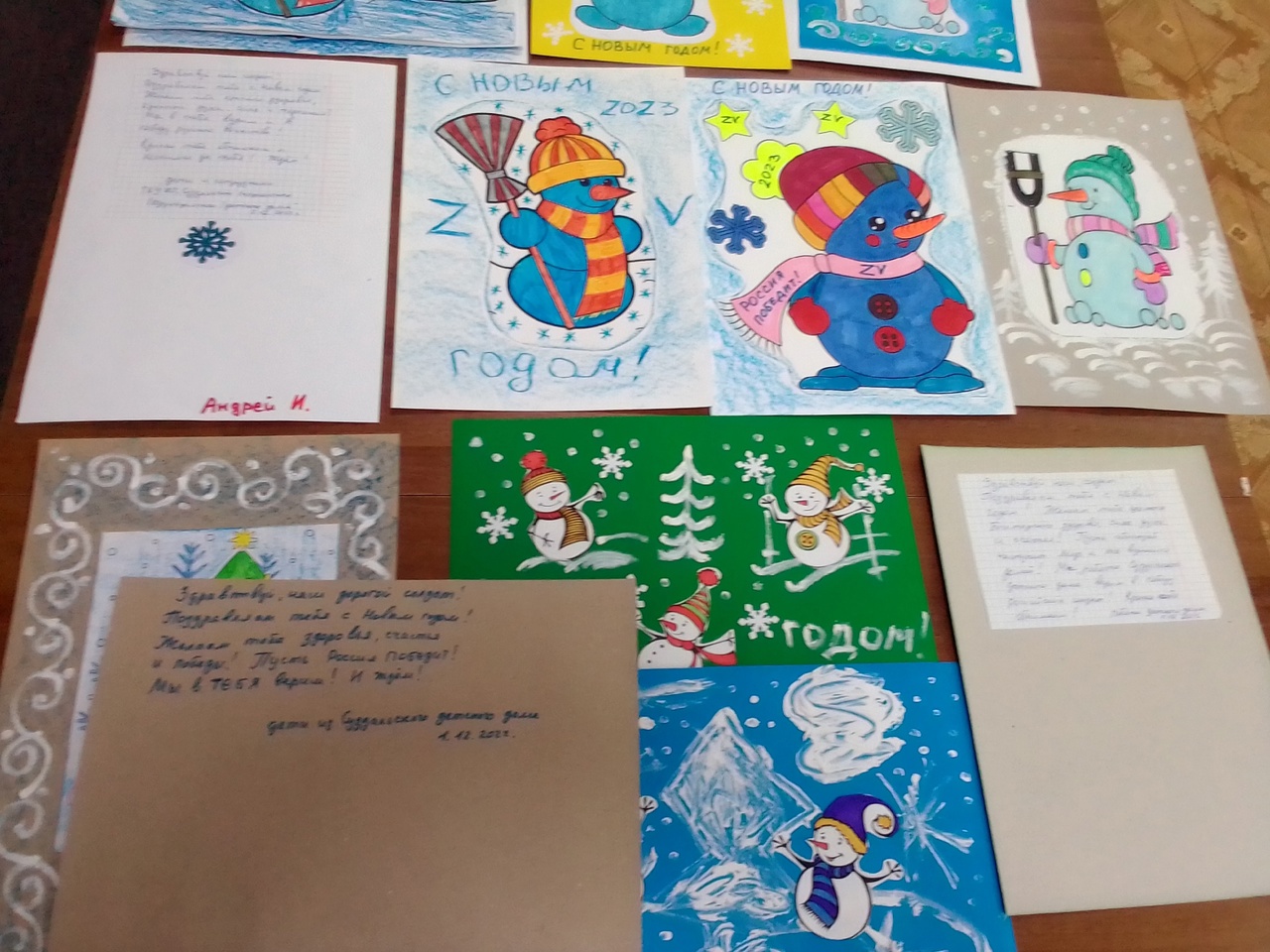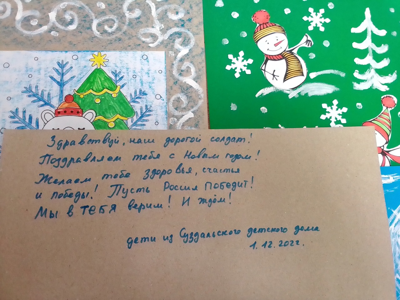 Воспитанники нашего детского приняли участие во Всероссийской социально-значимой акции "Согревая сердца" . Ребята подготовили поздравительные открытки к Новому году для военнослужащих , находящихся в госпитале города Курска. Пожелали им здоровья, счастья и ПОБЕДЫ!